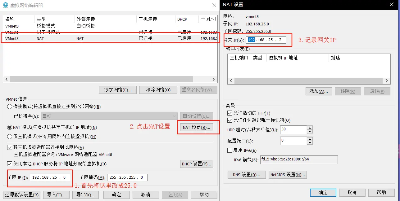 首先需要在VMware中配置自己的NAT网关,我这里以192.168.25.0为例。