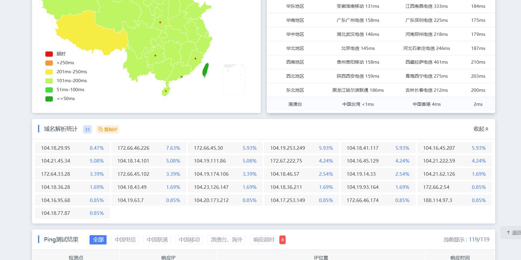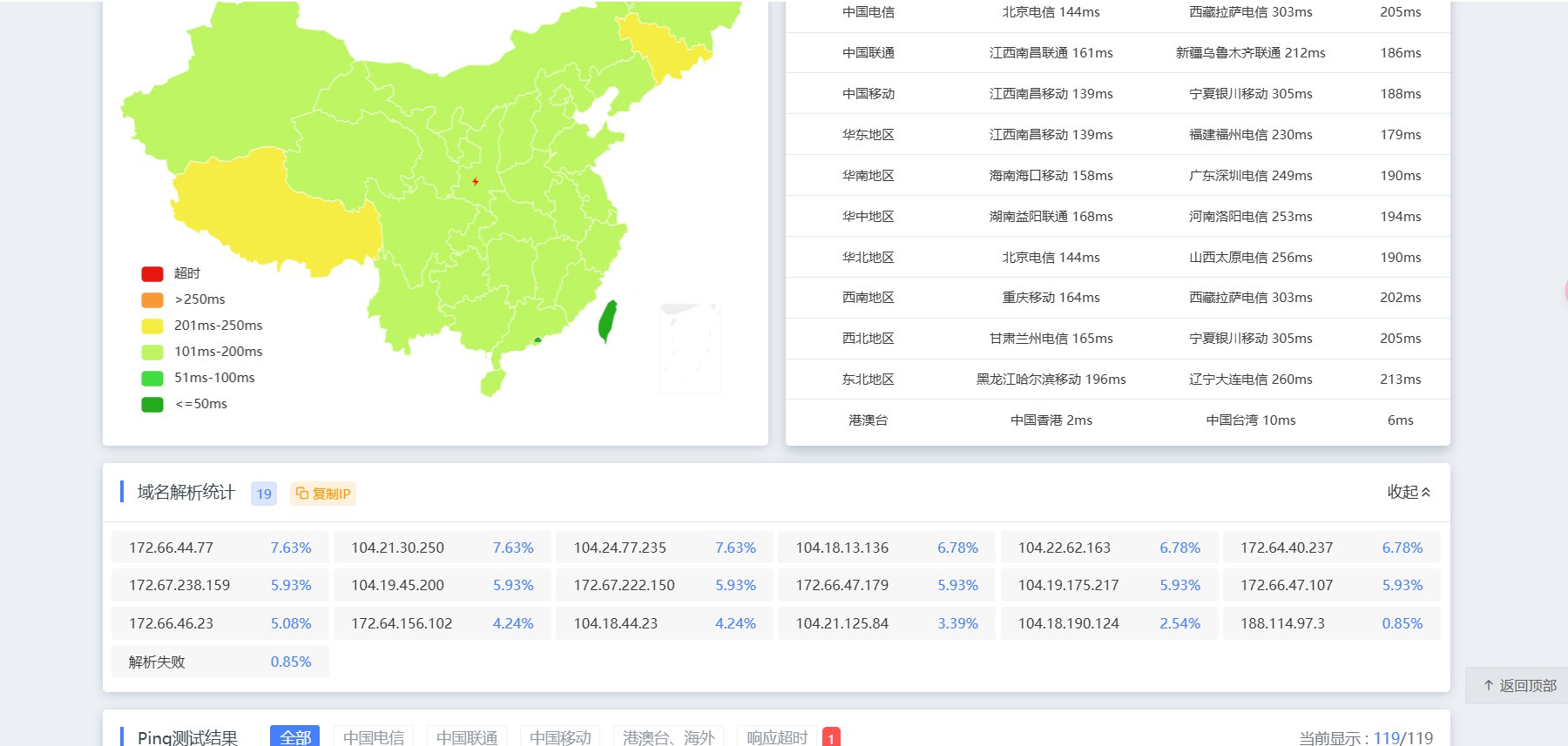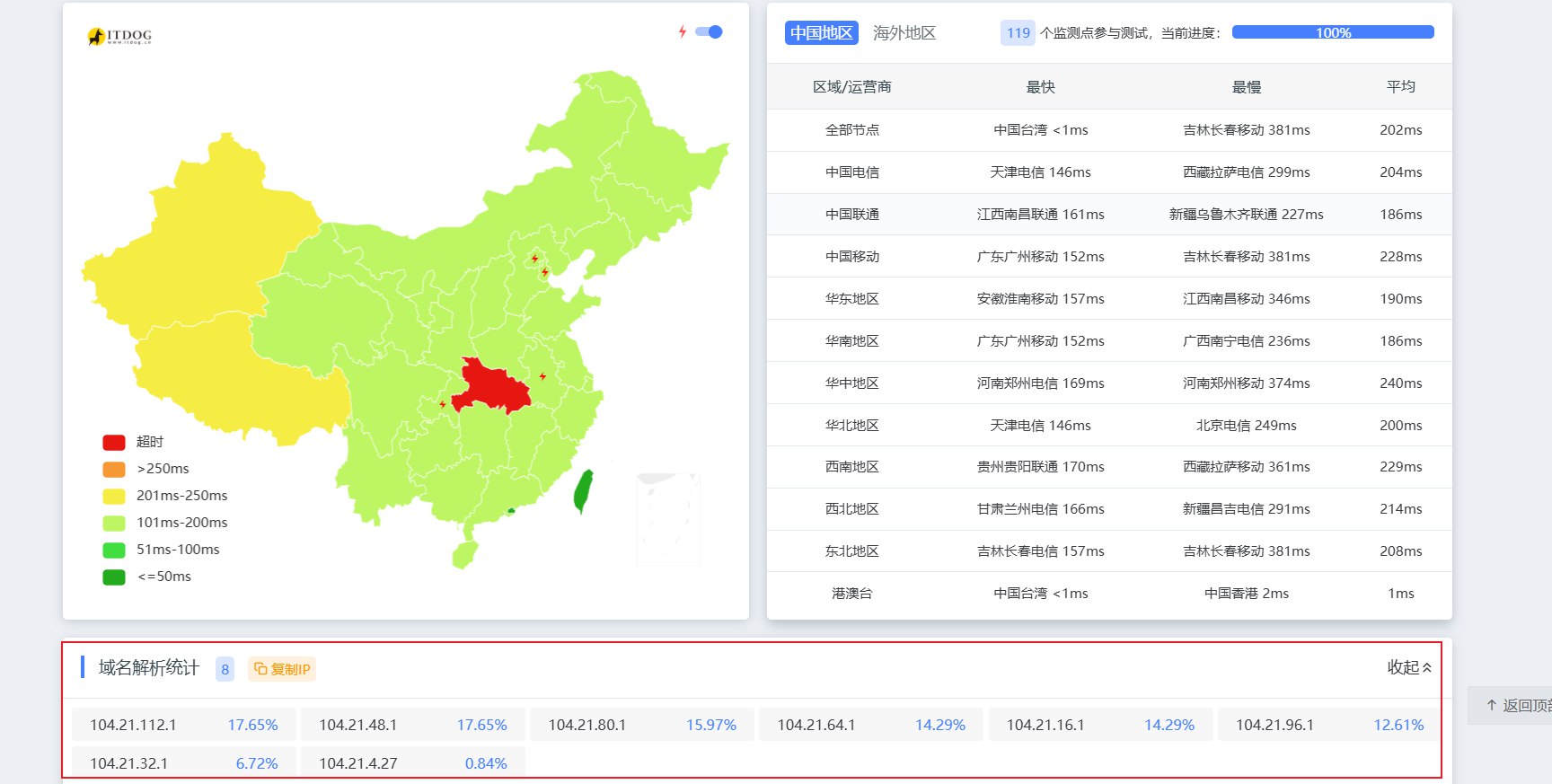 因为平时都是利用Cloudflare托管的域名,开启CDN这样能隐藏真实IP,并且能防止DDOS,但是这个也是著名的“减速器”,基本上托管上去的网站没几个地区能访问的(河南联通测试,没有一个应用能访问),没有优选之前通过ITDOG测速,主要出口节点也就是104的这个地址(这里我是在杭州进行测试,杭州比河南的的限制要低不少,在杭州地区我的一些网站不用通过VPN也能直接访问虽然速度很慢,但在河南完全不行),而且下面还伴随有22个访问失败。