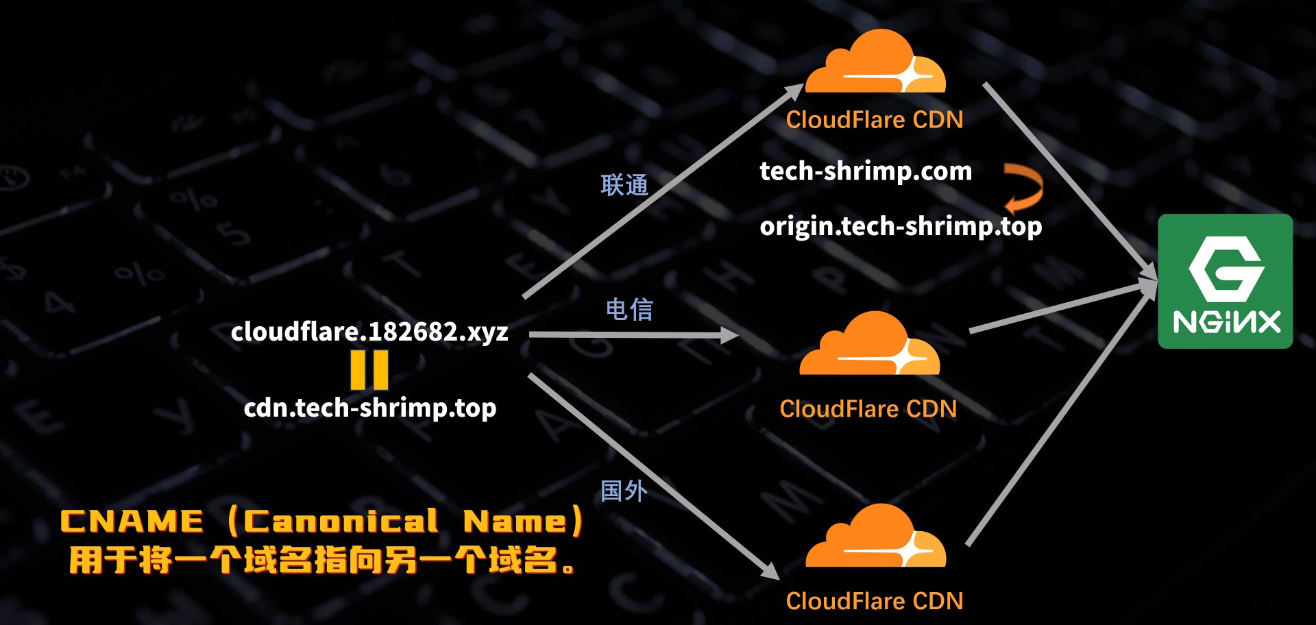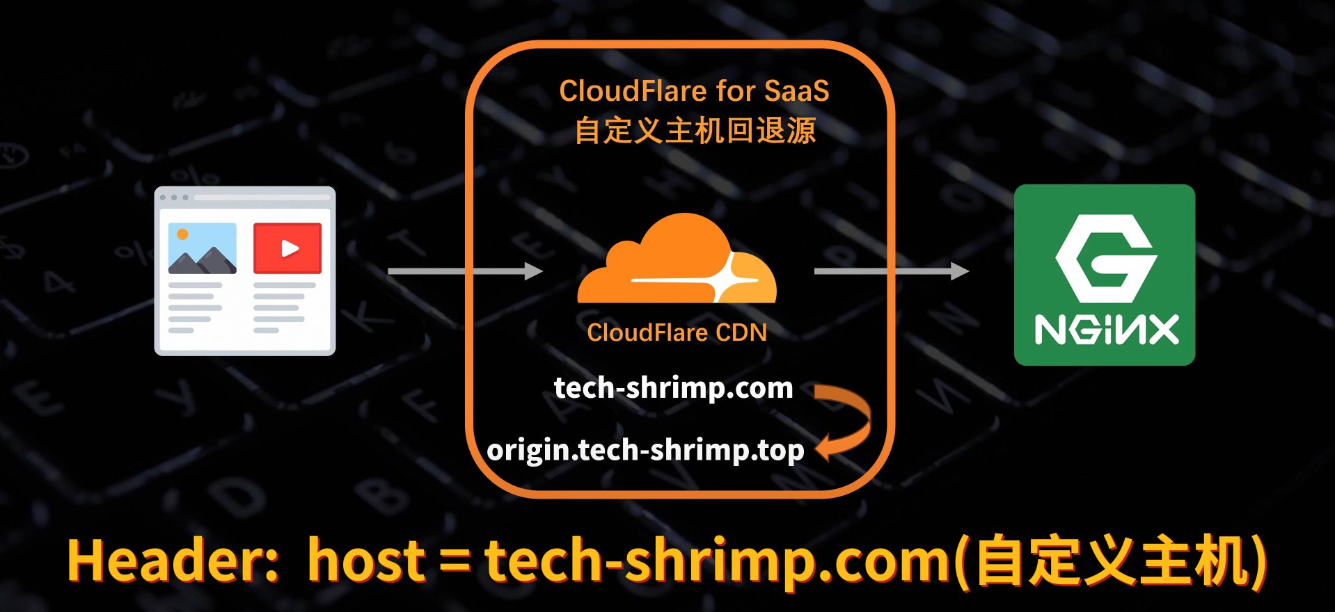origin.tech-shrimp.top作为回退源,当访问的Header中包含host=tech-shrimp.com的,就回退到origin.tech-shrimp.top。然后用我们要请求的域名cname到一个对cloudflare优选过的域名即可完成加速。