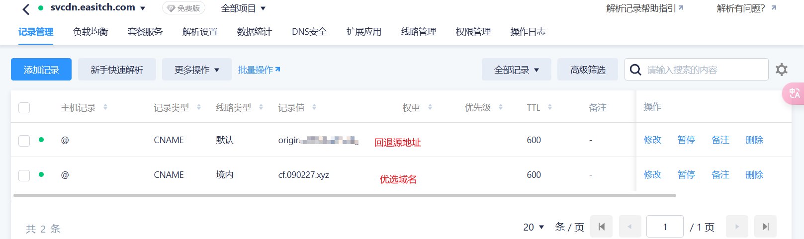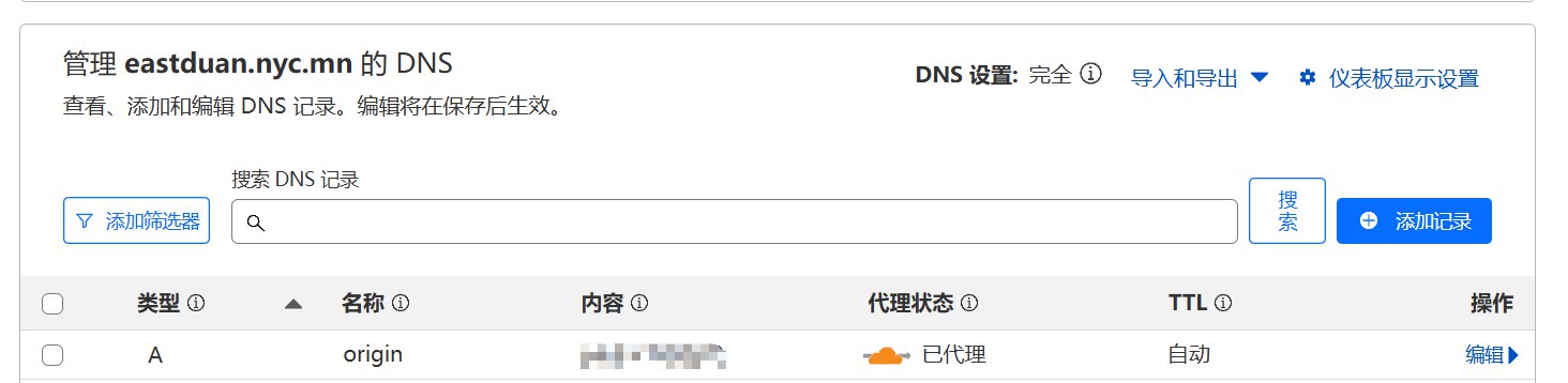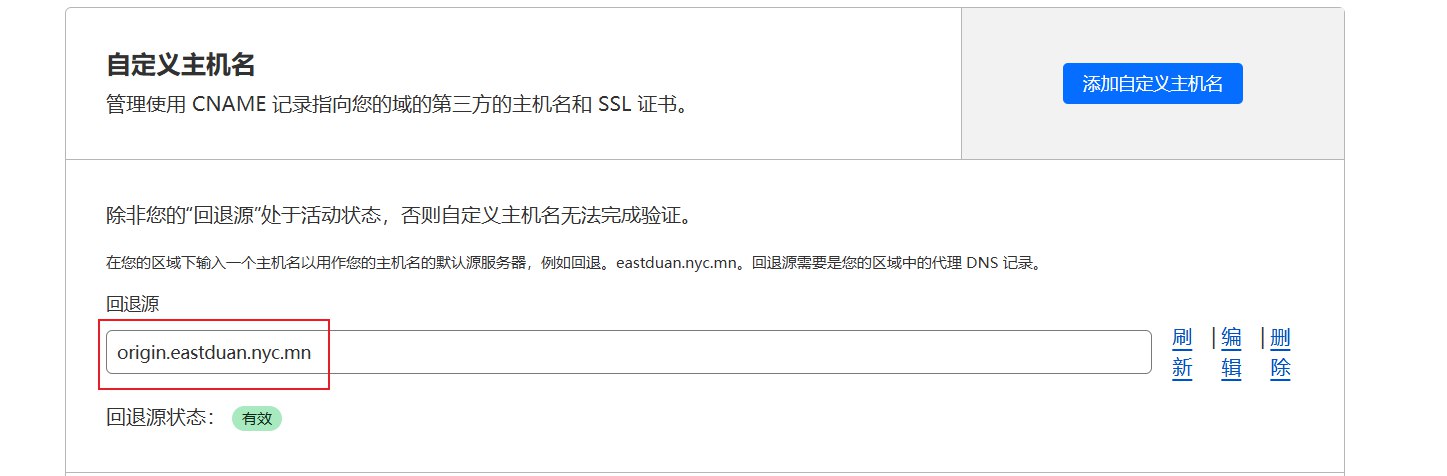 首先在辅助域名中配置记录回源地址,origin.eastduan.nyc.mn。