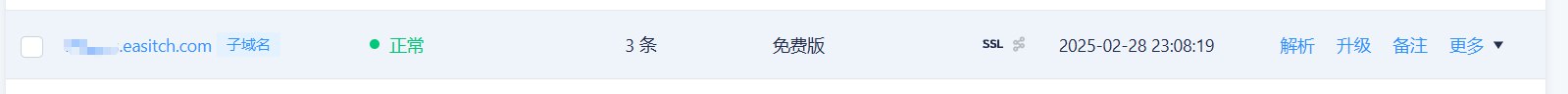 在DNSPOD中托管一个二级域名(自己要访问应用的地址),例如test.easitch.com。根据提示,需要在Cloudflare中添加2条NS和1条TXT的记录然后刷新状态。