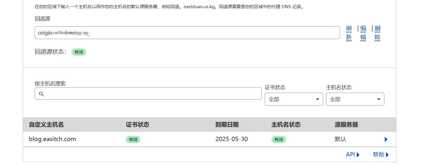 然后进入自定义主机名选项卡,填写回退源地址,以及添加自定义主机名(blog.easitch.com)。