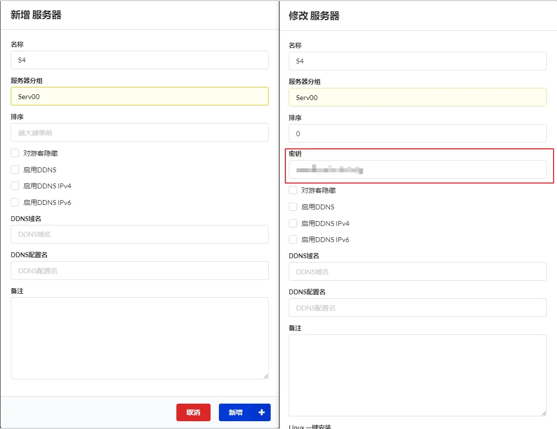 安装完成后,会获得访问的URL地址,请记牢。进入管理后台,先新增服务器,然后再点击修改就可看到密钥,这个密钥要记牢!